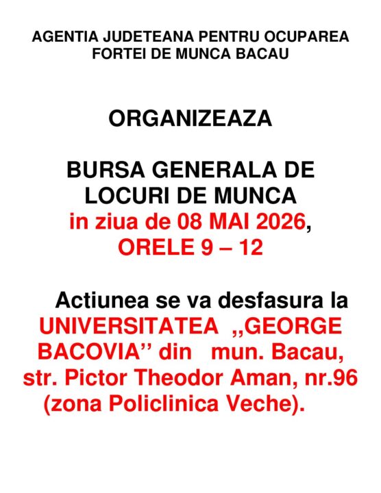 AJOFM Bacău organizează Bursa locurilor de muncă 2026, în data de 8 Mai 2026