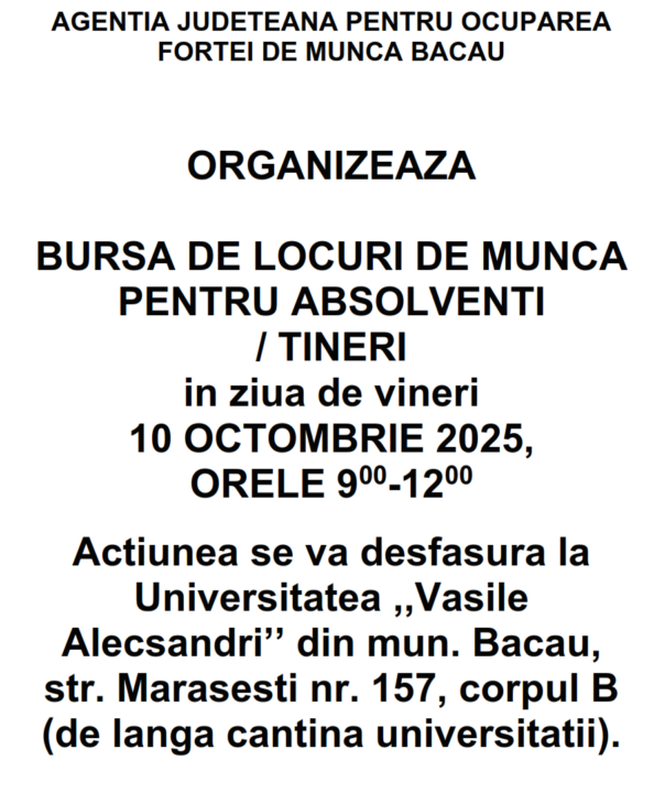 • Anunț AJOFM: Bursa locurilor de muncă pentru absolvenți, vineri, 10 octombrie